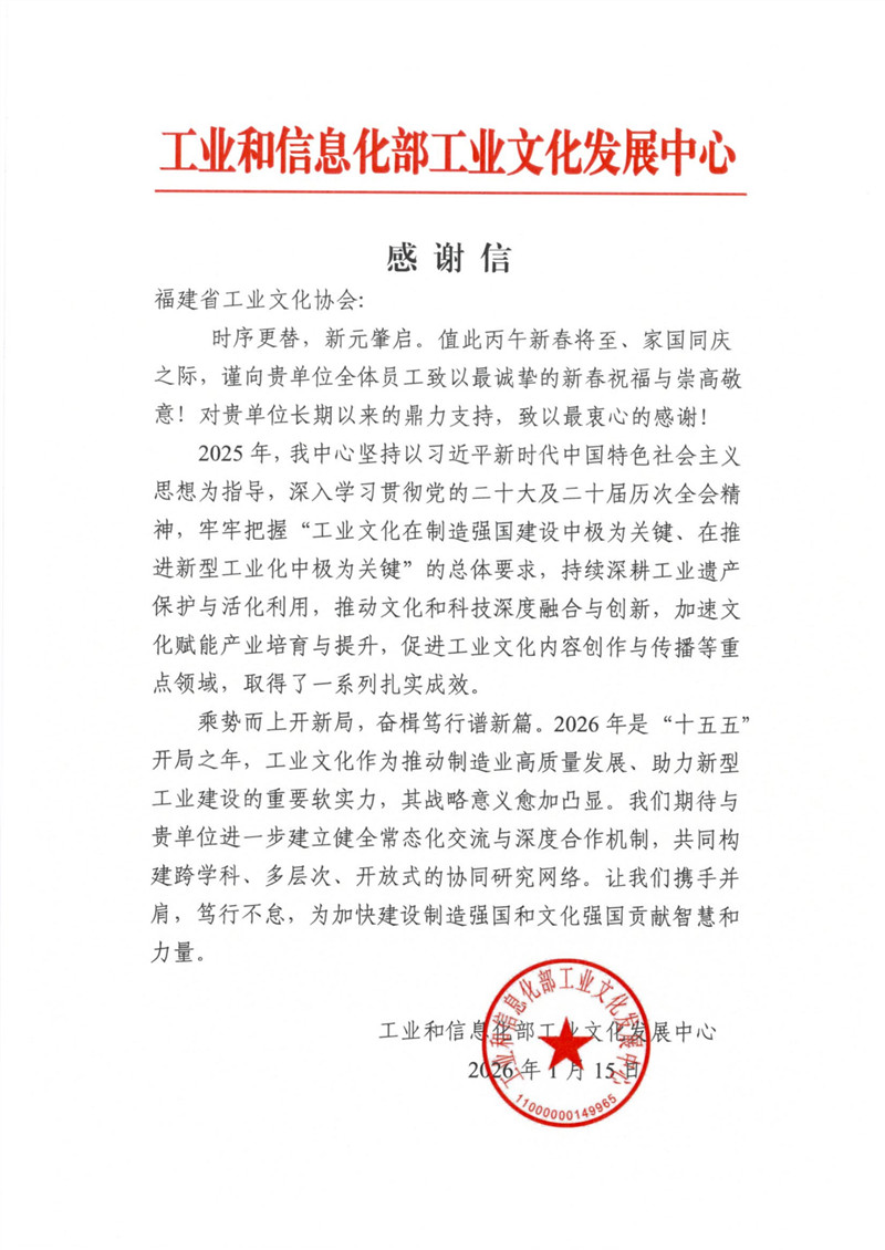 近日,福建省工业文化协会(以下简称协会)收到工业和信息化部工业文化发展中心发来的感谢信。信中对协会长期以来的鼎力支持致以衷心的感谢,并向协会全体同仁致以诚挚的新春祝福。